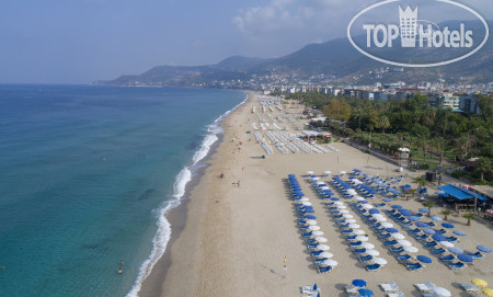 Рядом с отелем находится известный пляж Клеопатры. Широкая береговая линия протяжённостью почти 3 км. Пляж песчаный, песок крупный, можно даже сказать, что больше похож на очень мелкую гальку. В некоторых местах при входе в воду есть камни, это хорошо видно сверху или при соответствующем освещении. Рядом с отелем находится как раз участок пляжа без таких камней. Плюс хороший вид на гору с крепостью.