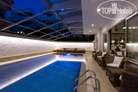 На первом этаже помимо ресепшн располагались ресторан, лобби, комната для багажа, бар, небольшой бассейн с лежаками. Территории у отеля нет, так как он городской.